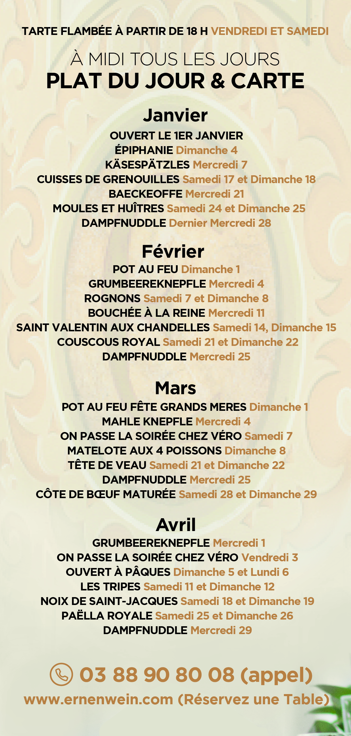 lundi, mardi, mercredi, vendredi et dimanche de 9h à 14h vendredi, samedi de 18h à 20h